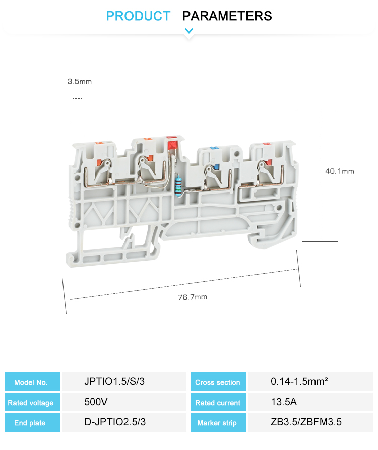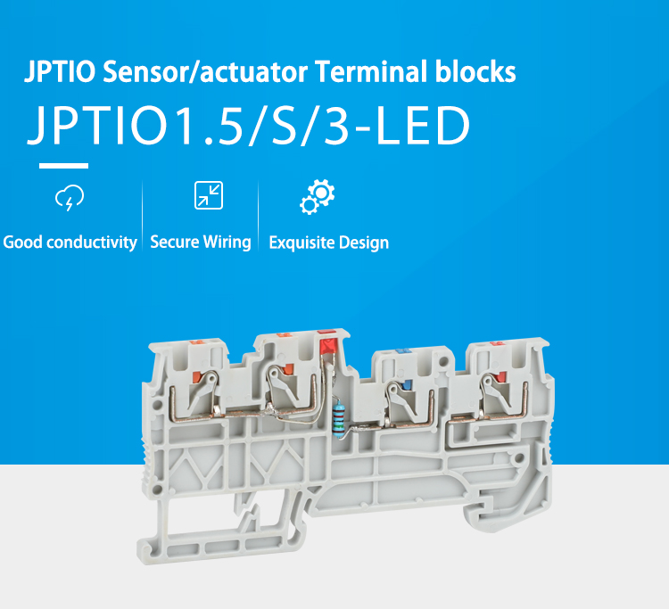 JPTIO1.5/S/3-LED(24V) terminal block The terminal block adopts flame-retardant nylon PA66, brass conductor and stainless steel compression spring to ensure electrical safety and mechanical strength under harsh working conditions.