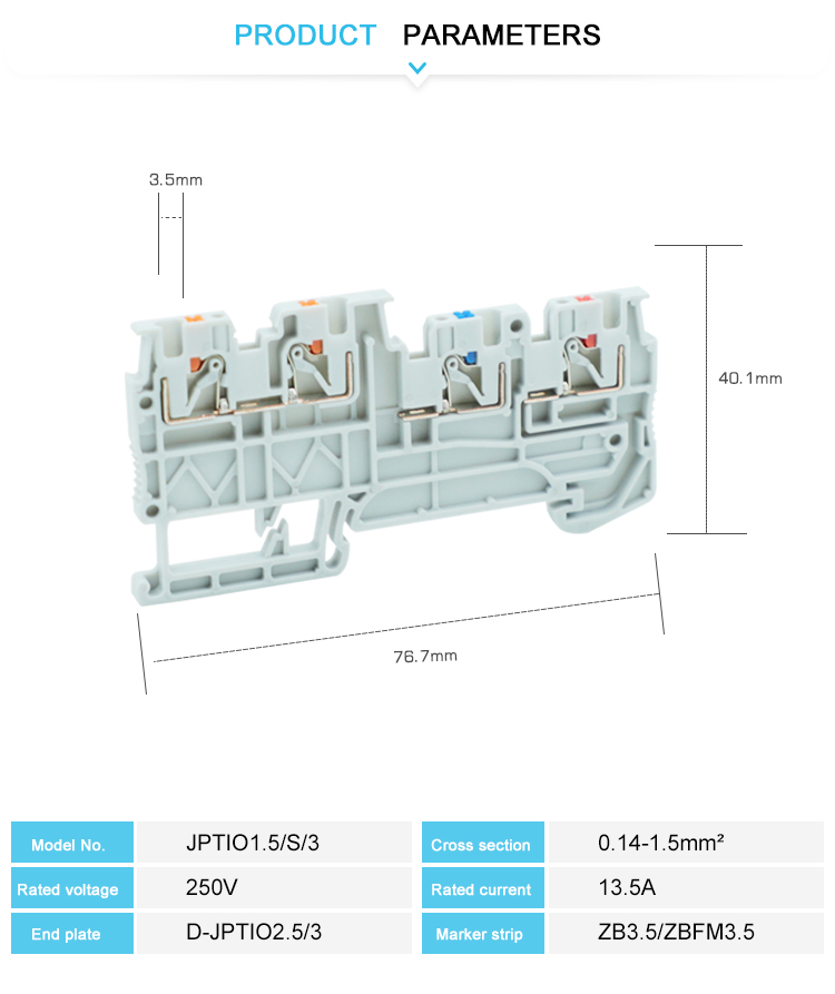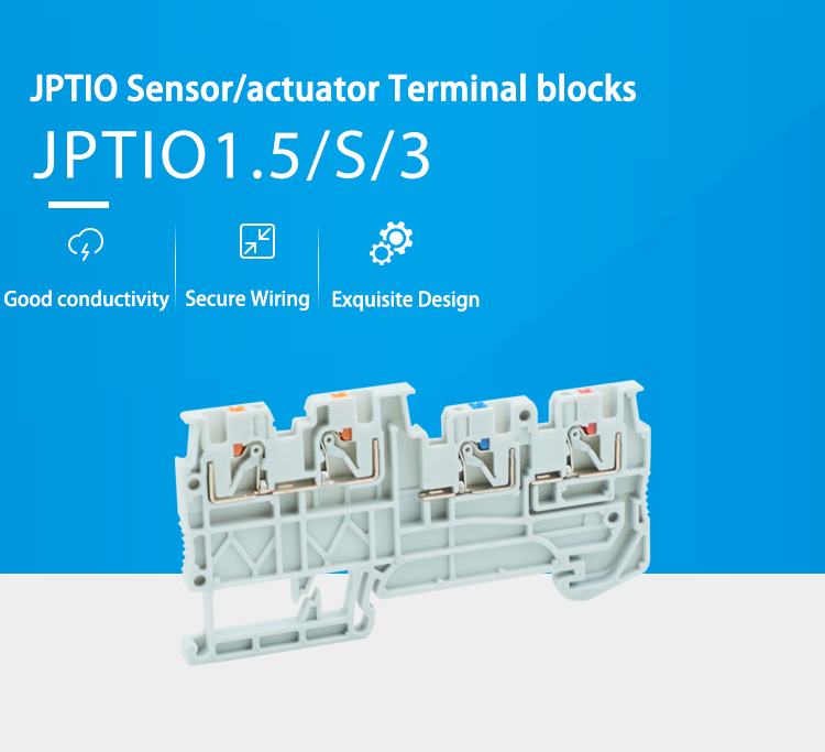 PTIO1.5/S/3 terminal block The terminal block adopts flame-retardant nylon PA66, brass conductor and stainless steel compression spring to ensure electrical safety and mechanical strength under harsh working conditions.