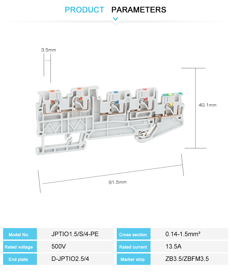Made from engineering flame retardants nylon PA66 with brass screw metal.Made from engineering flame retardants nylon PA66 with brass screw metal.The Push-in connection terminal blocks are characterized by easy and tool-free wiring of conductors with ferrules or solid conductors.The compact design and front connection enable wiring in a confined space.In addition to the testing facility in the double function shaft, all terminal blocks provide an additional test connection.With universal foot which can be installed on Din Rail NS 35.It can connect two conductors with ease, even large conductor cross sections are not a problem.Electric potential distribution can use fixed bridges in the terminal center.All types of accessories: End cover, End Stopper, Partition plate, marker trip, fixed bridge, insertion bridge, etc.