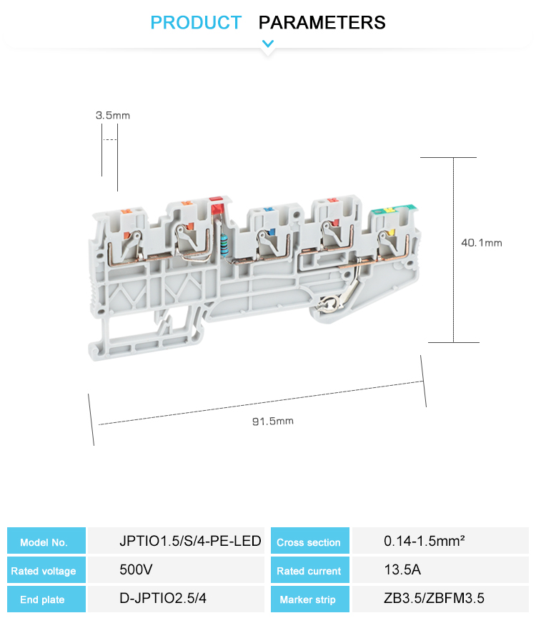 CE/RoHS/CQC/ISO 9001JPTIO1.5/S/4-PE-LED(24V) Sensor Actuator Terminal BlockThe Push-in direct connection technology make the insertion forces reduced by up to 50 percent and tool-free wiring, enable the conductors to be inserted easily and directly.Made from engineering flame retardants nylon PA66 with brass screw meta......