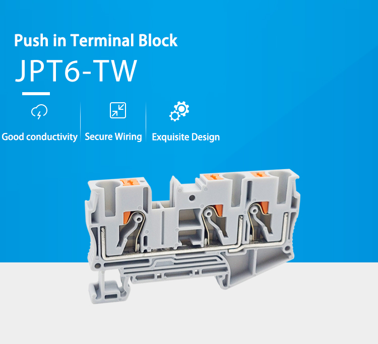 JPT16TW terminal block (Push-in) As a tool-free circuit connector, users can complete a stable electrical connection by pushing the cable. JPT16TW terminal block The product is made of engineering plastic or metal, with high temperature resistance and corrosion resistance to ensure durable and reliable operation in multiple environments.