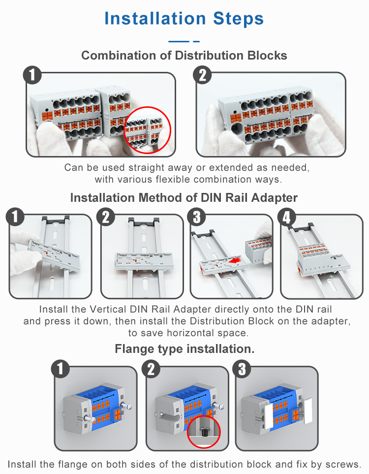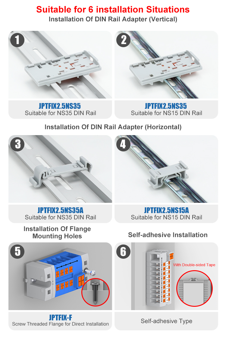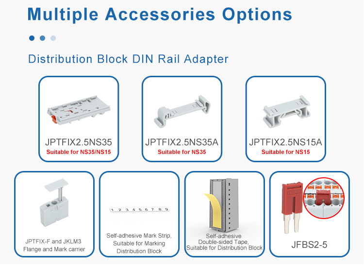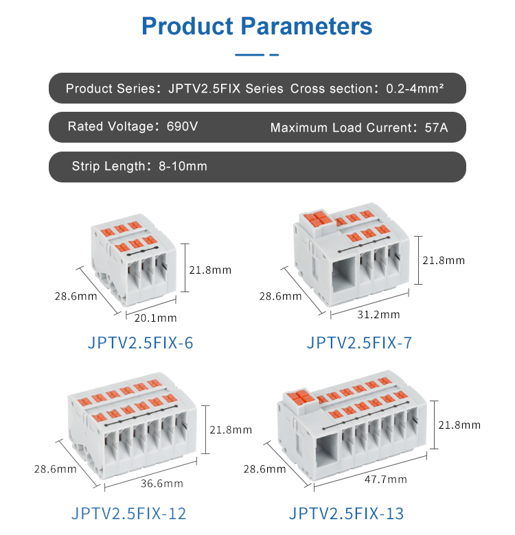 The JPTV2.5FIX-13 is a compact 13-position fixed distribution block designed for reliable multi-point electrical distribution in control systems and switchgear. It supports a versatile wire range with line contacts of 0.5–10 mm² and load contacts of 0.14–4 mm². The block is rated for 690V and 41A, with a continuous current capacity of 24A, ensuring robust performance in industrial environments. It is constructed in durable gray nylon and is sized at 47.7×28.6×21.8 mm (L×W×H), making it suitable for space-efficient DIN rail mounting. The terminal block is compatible with ZBV2.5 marker strips for clear circuit identification, facilitating organized installation and maintenance.